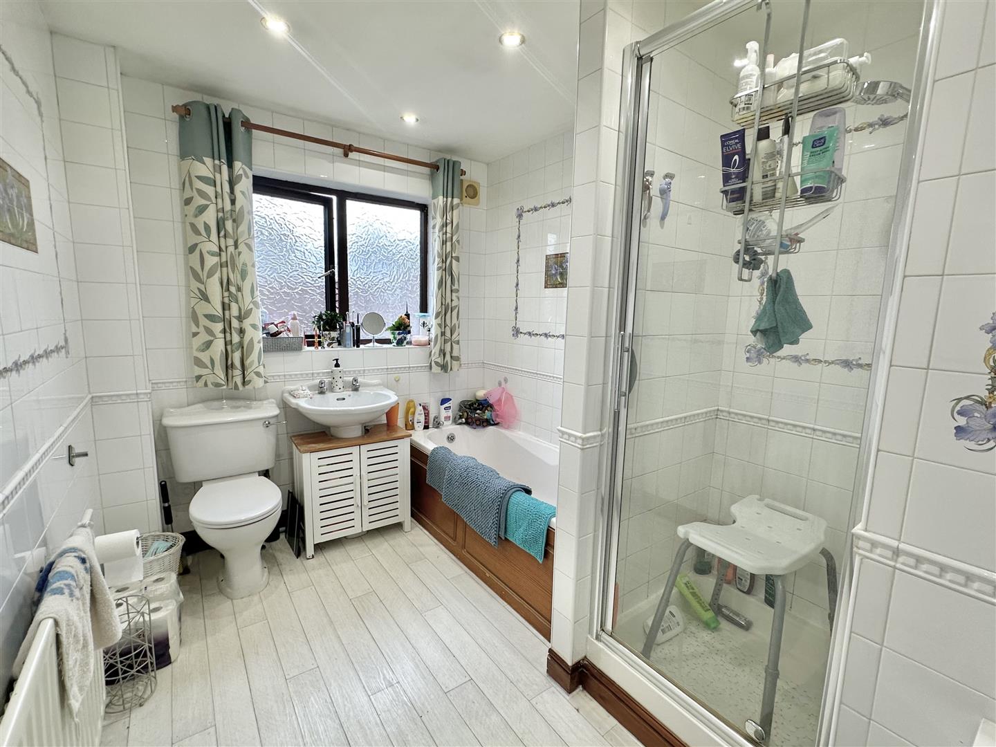 Upstairs, the property continues to impress with three well-proportioned bedrooms, each offering a comfortable amount of space for furniture and storage. The large family bathroom is fitted with a panelled bath, separate step-in shower cubicle, WC, and wash hand basin on a pedestal, all complemented by tiled surrounds for ease of maintenance.