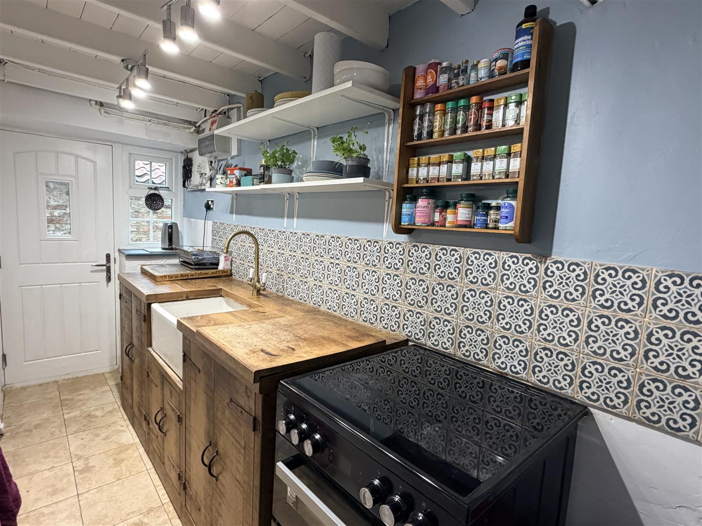 The kitchen is arranged in a galley style, fitted with timber worktops, a Belfast-style sink, and open shelving. It offers a practical working layout with access to the rear.