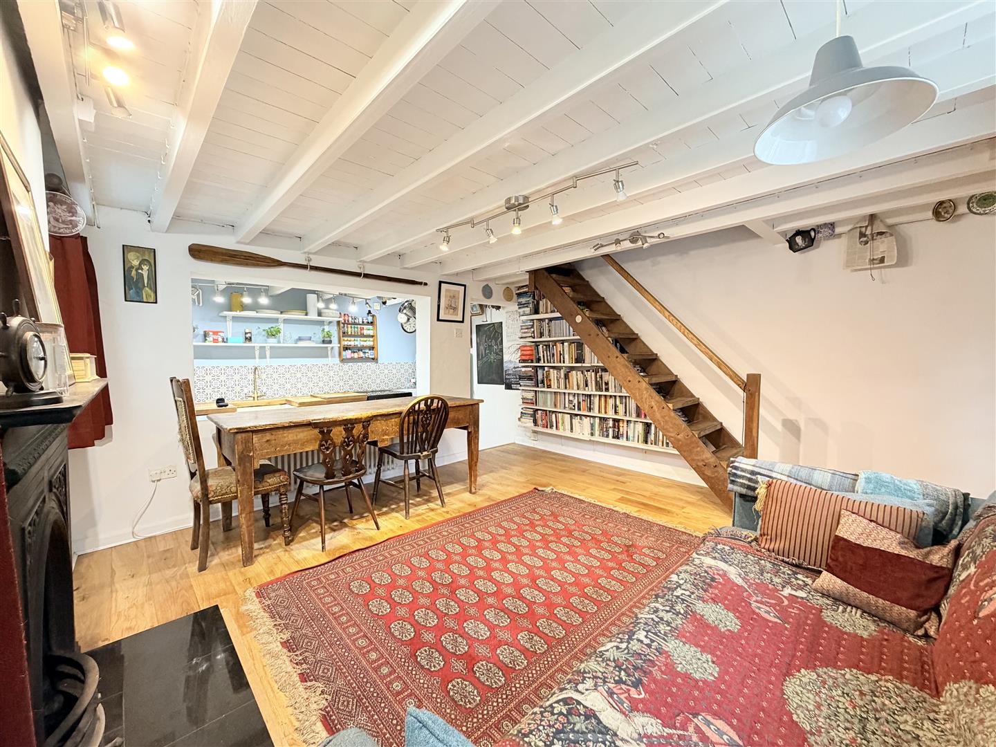 Entry is via a vestibule, leading through into the living room. This is a well-proportioned space with exposed beams and an open fire forming the focal point, with enough room for both seating and dining.