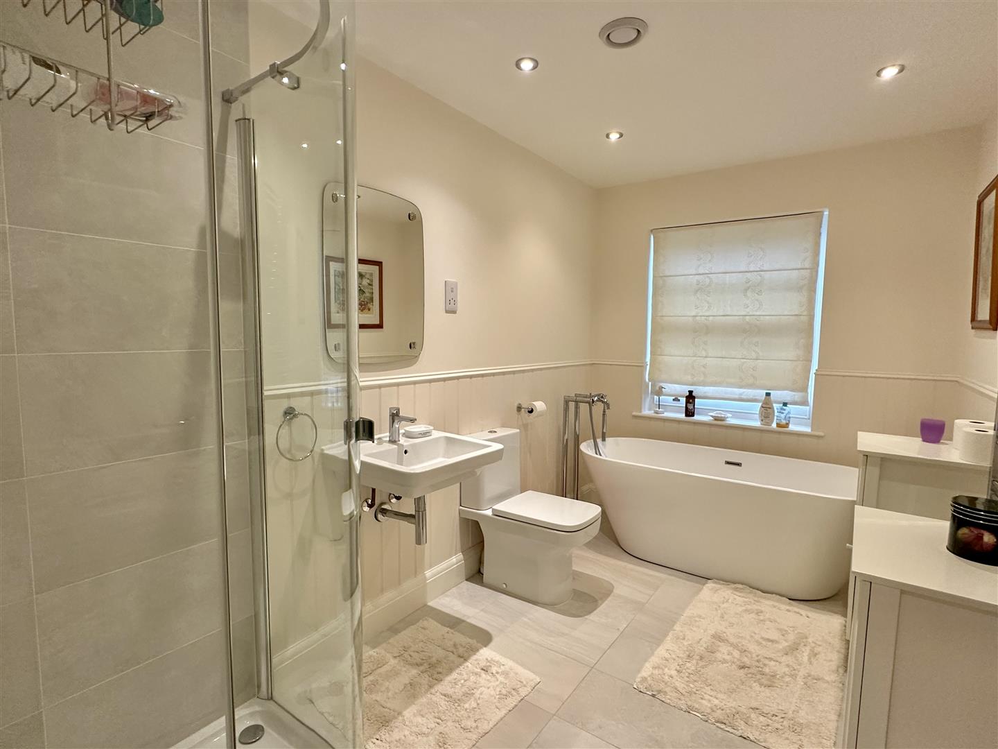 On the first floor, a generous landing provides access to all bedrooms, the family bathroom, and a useful double linen cupboard. The property offers four well-proportioned double bedrooms, two of which benefit from en-suite facilities. The principal bedroom includes a walk-in wardrobe, while the remaining three bedrooms are all fitted with wardrobes, providing good built-in storage throughout. The family bathroom is well appointed, featuring a freestanding bath with central taps, a separate walk-in shower cubicle, WC, and a wash hand basin set within a tiled surround, creating a practical and comfortable space for family use.
