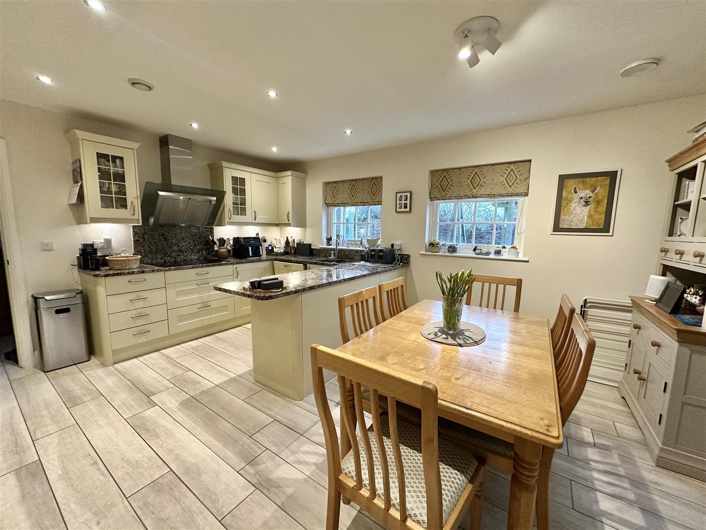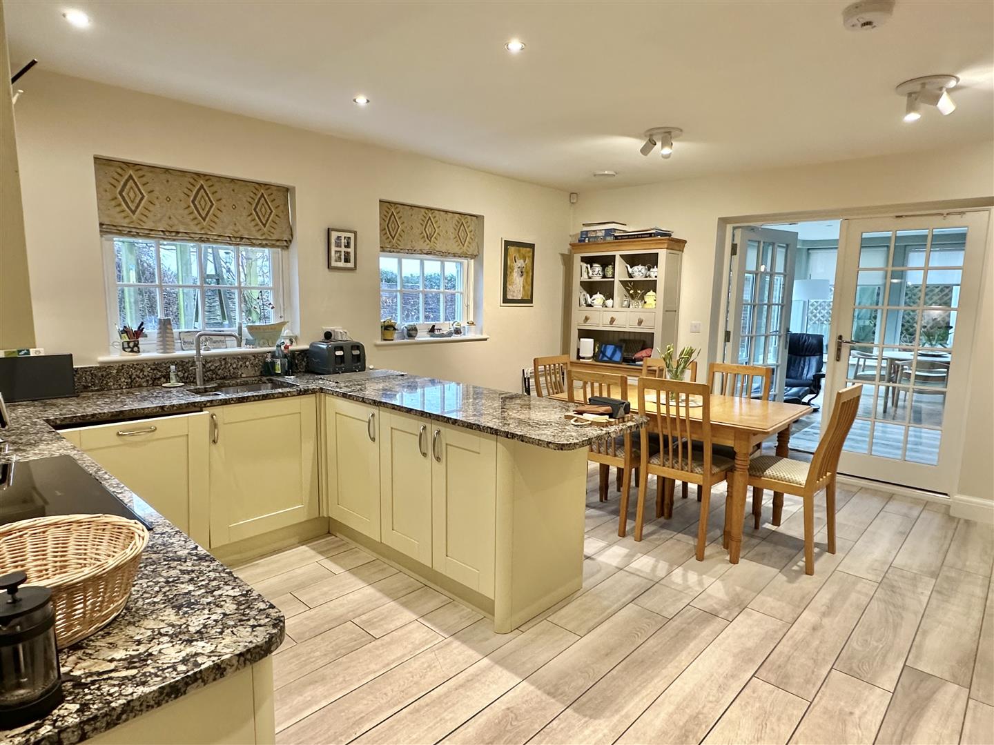 On entry, a generous reception hall provides access to the majority of the ground floor accommodation. The drawing room is well suited to both family use and entertaining, with windows to two elevations allowing plenty of natural light throughout the day. Double French doors lead from here into the garden room, a later addition that forms the main living space of the home. Overlooking the landscaped rear gardens, the room benefits from a large lantern ceiling for natural light and thoughtful detailing, including concealed window hinges. It also links directly to the breakfast kitchen, making this area particularly well suited to everyday living and entertaining.