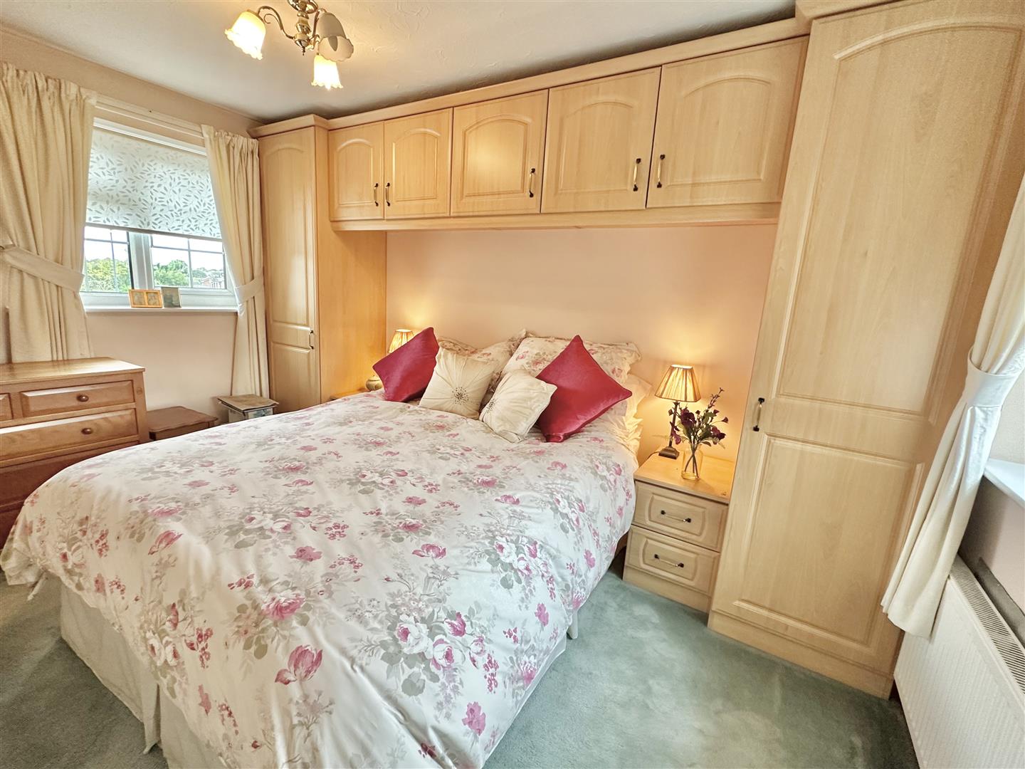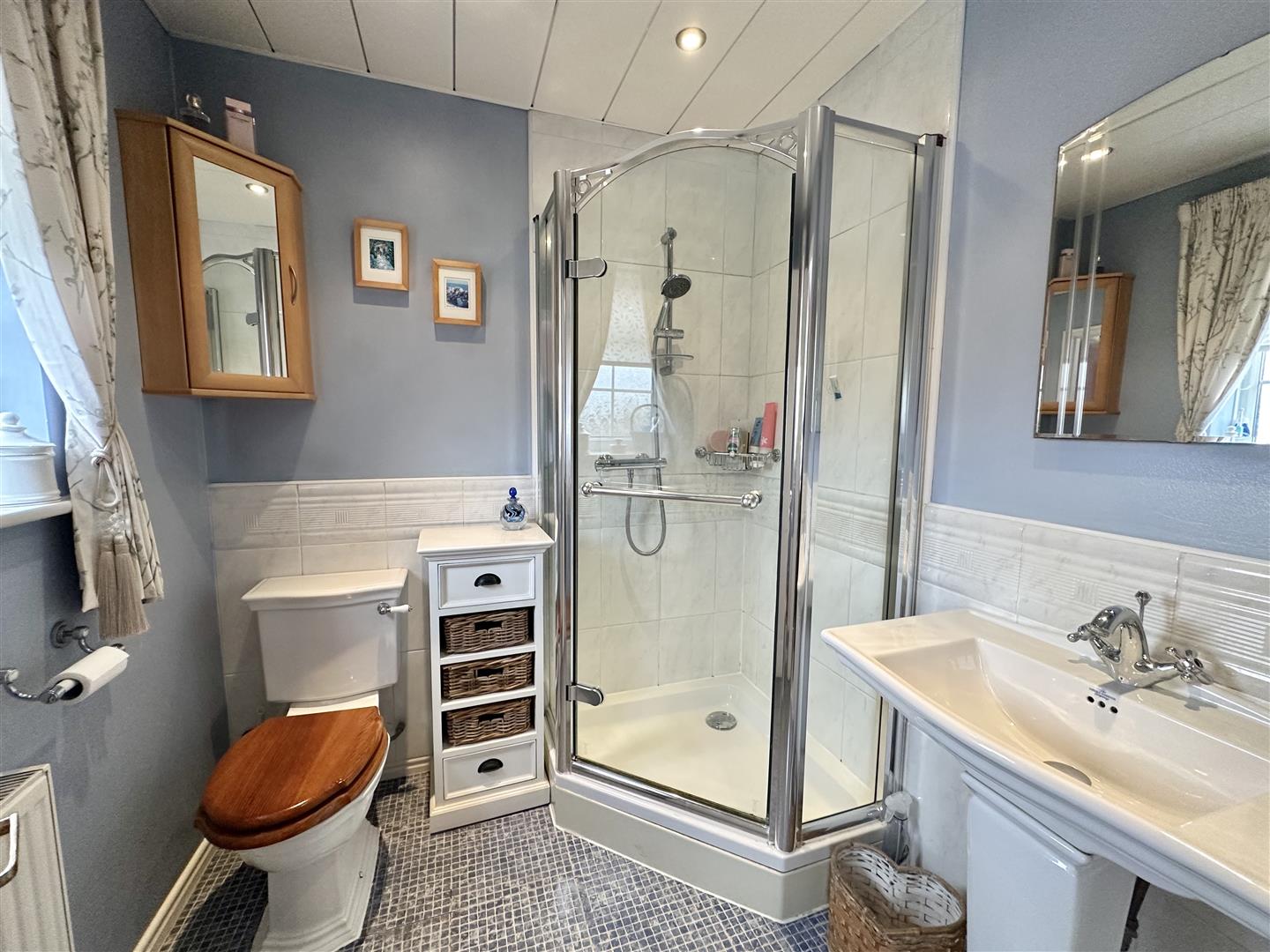 On the first floor, there are three well-proportioned double bedrooms. Two include fitted wardrobes, with bedroom two benefitting from dual-aspect windows. The main bedroom also has its own shower room with a step-in shower, WC, and pedestal wash basin. The family bathroom is fitted with a bath and shower over, WC, and pedestal wash basin, with a window to the rear elevation.