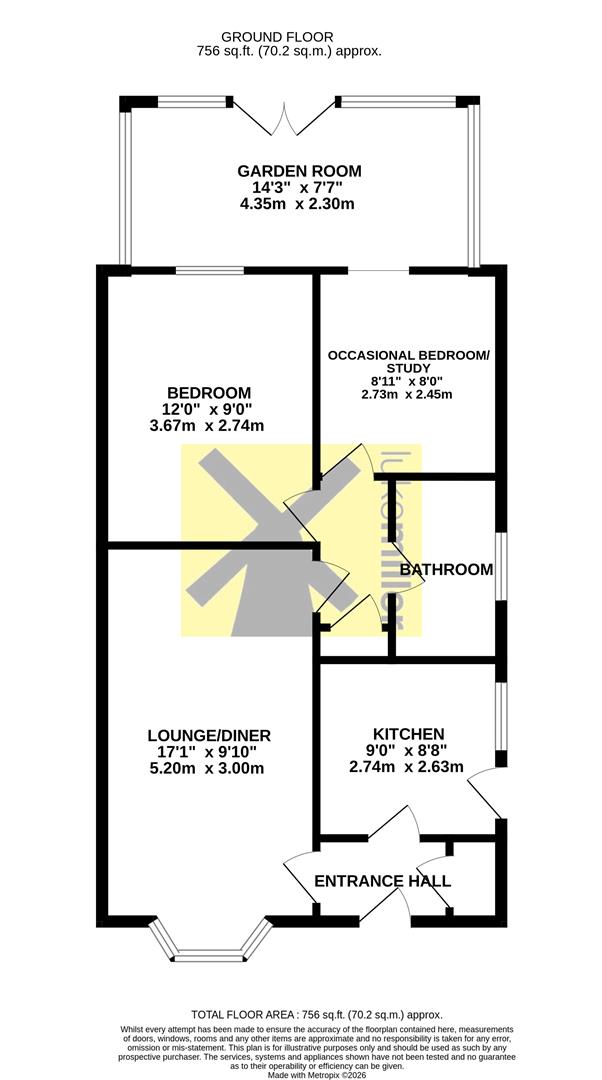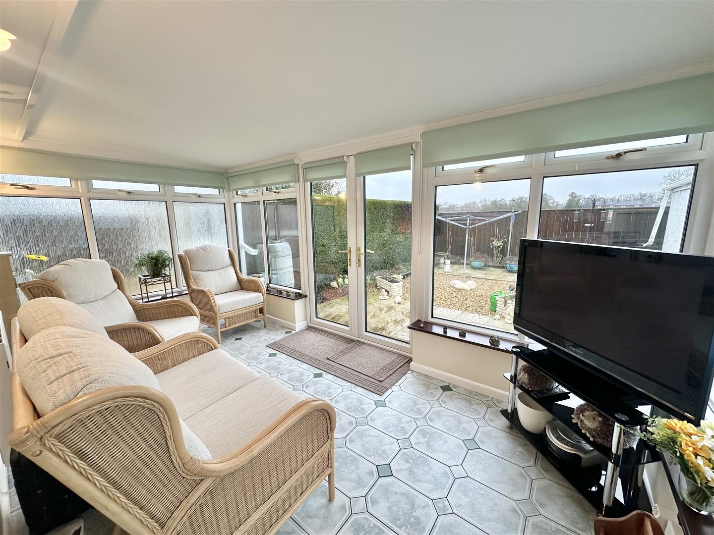 Beyond the living room, an inner hallway leads to the two bedrooms and the bathroom. The main bedroom benefits from fitted sliding wardrobes and a window to the rear elevation. Bedroom two works well as a guest room or home office and also provides access into the large garden room which features a tiled floor, views over the garden, and double doors opening outside.