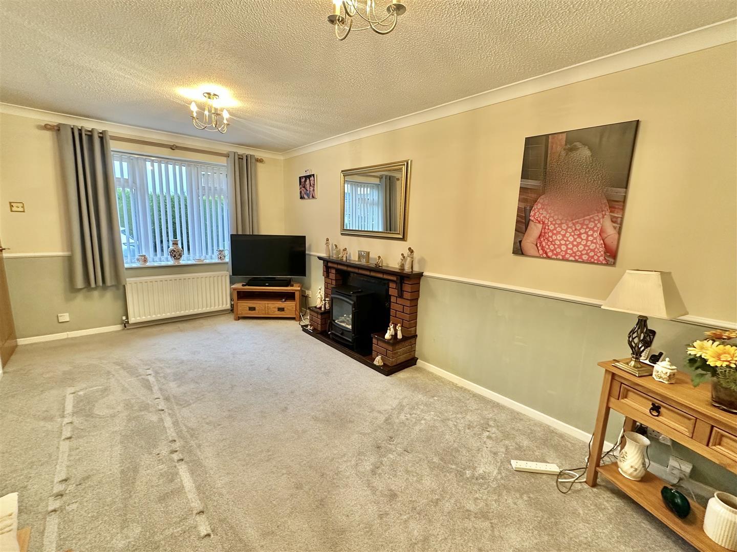 The spacious living room offers plenty of space for lounge furniture and a dining table if required, with a decorative electric fire forming the focal point. A large front-facing window brings in excellent natural light.