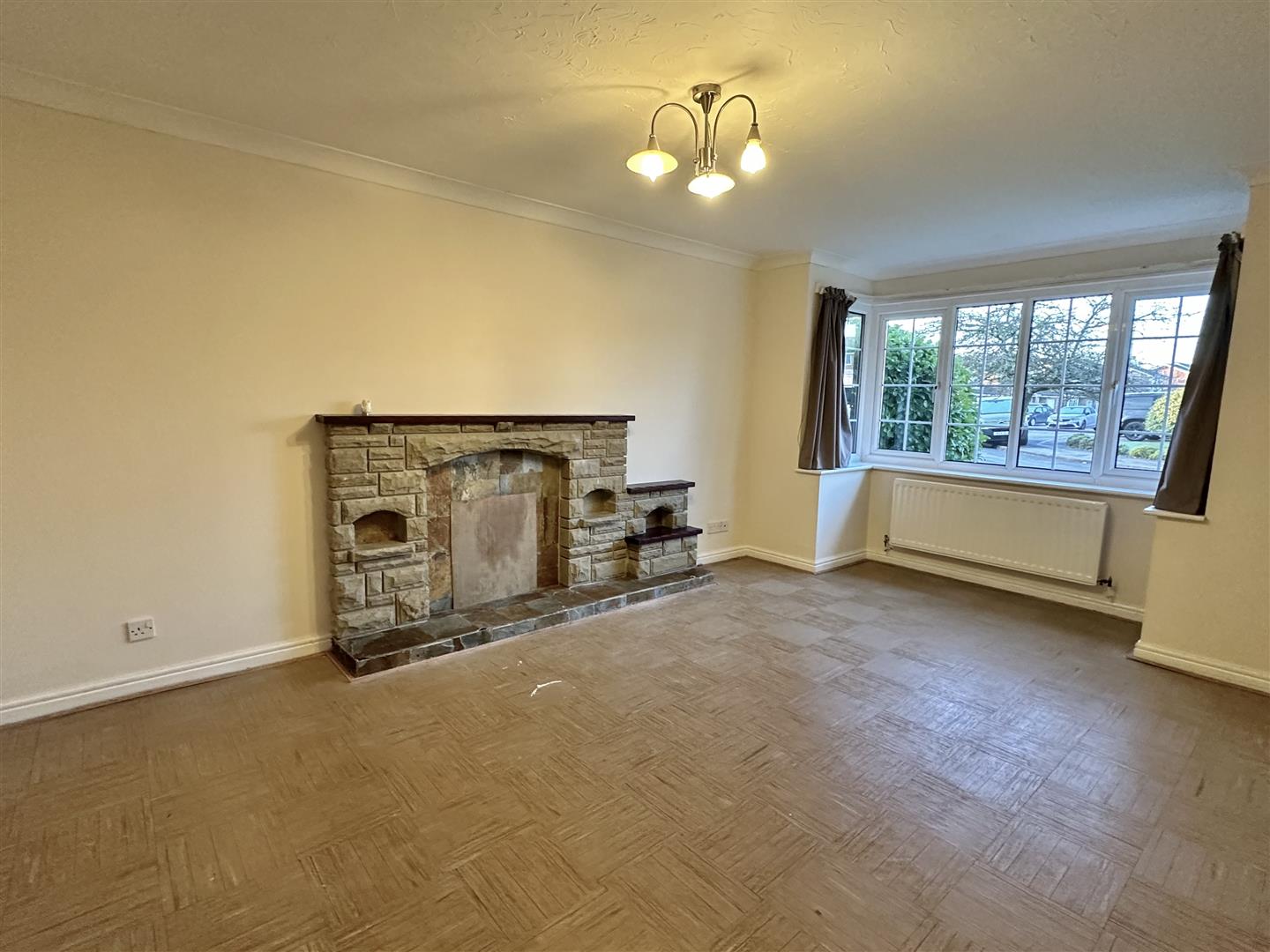 The large living room is positioned to the front elevation and features a box bay window, allowing plenty of natural light. A decorative fireplace with stone surround creates a focal point, making this a comfortable space for everyday use.
