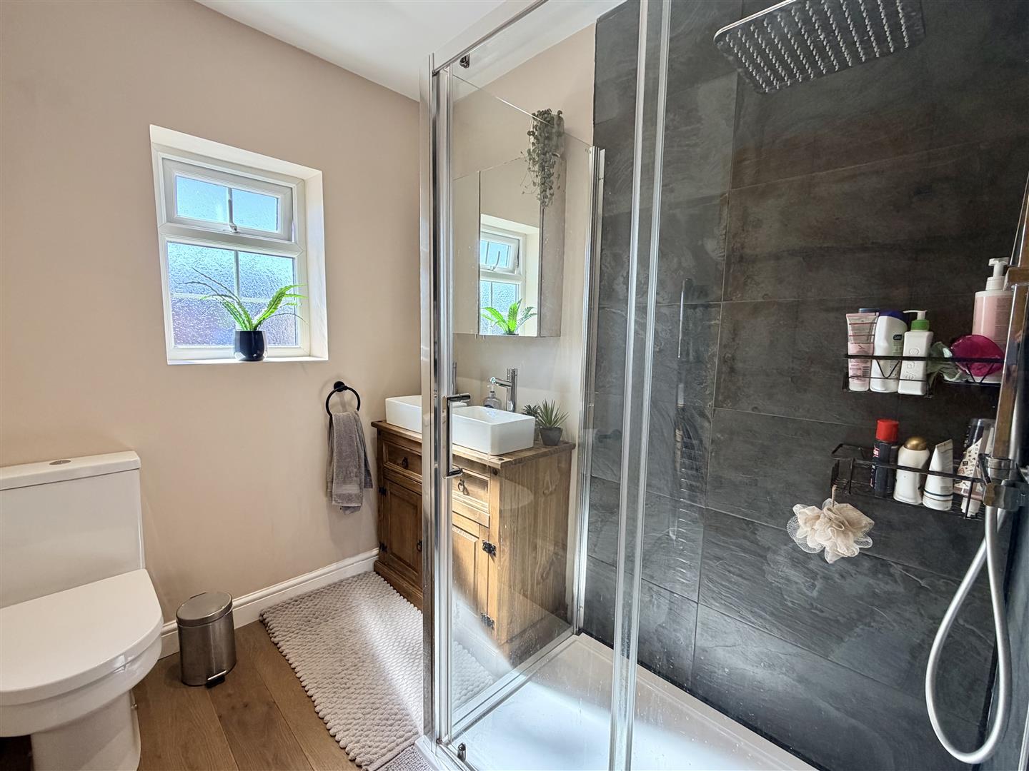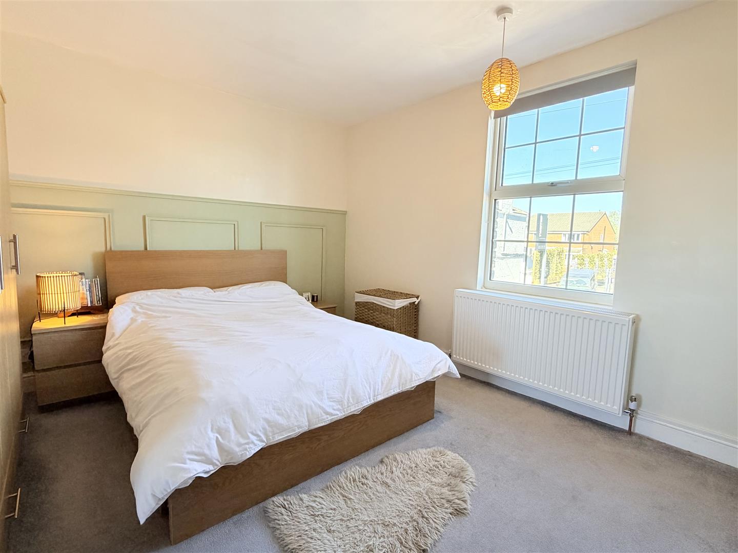 On the first floor, the principal bedroom is well proportioned with a front-facing window and a panelled feature wall. The shower room has been updated to include a double walk-in shower, WC, and twin vessel sinks set within a vanity unit, with tiling and a rear window completing the space.
