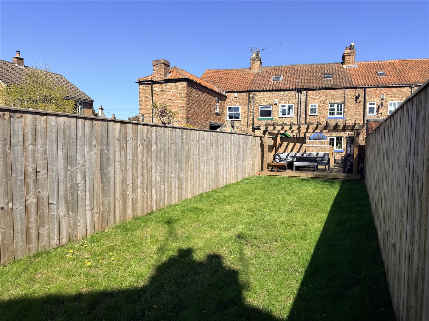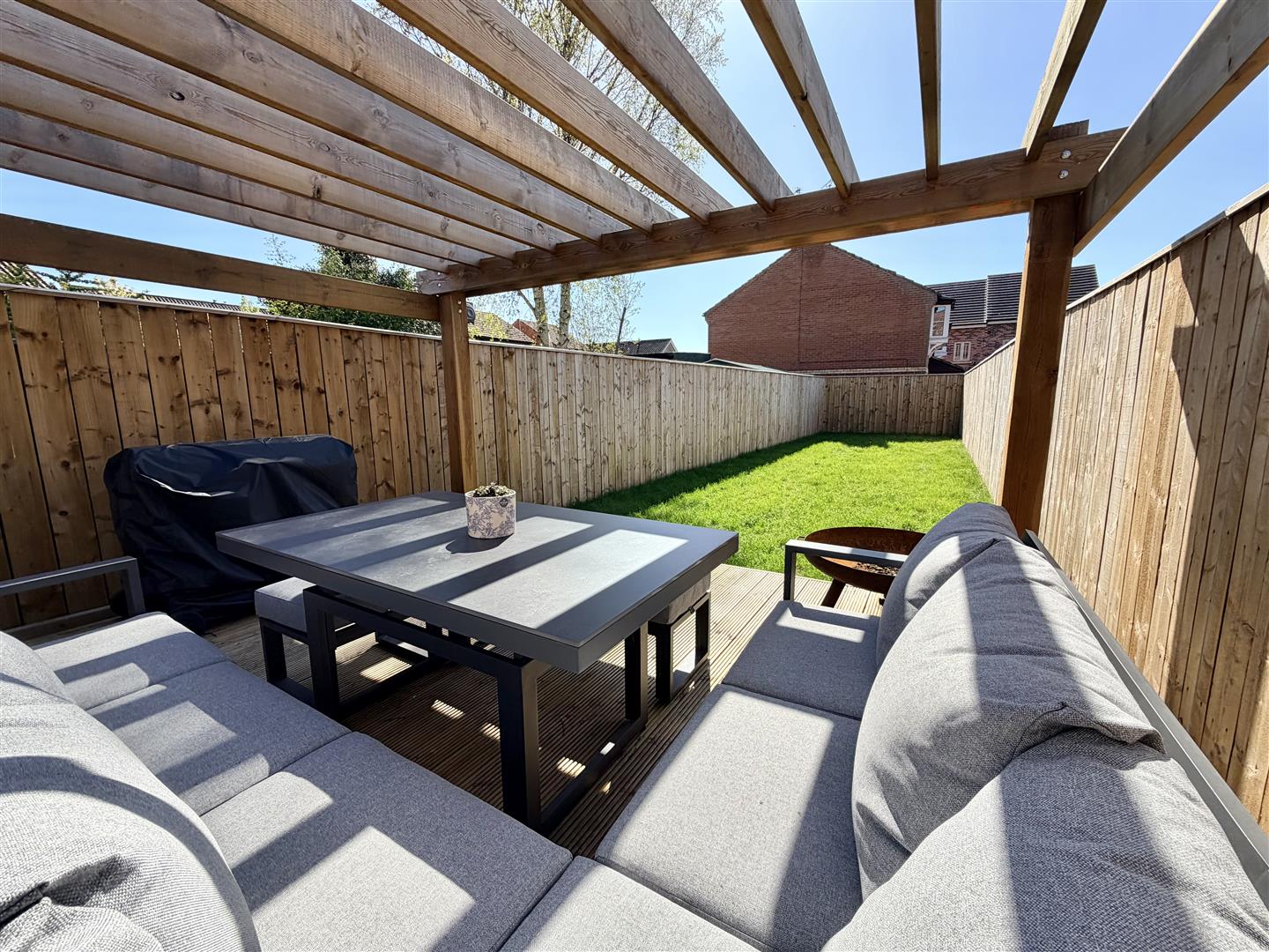 - Landscaped garden with raised seating area and pergola