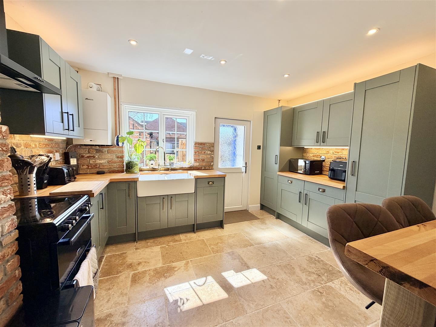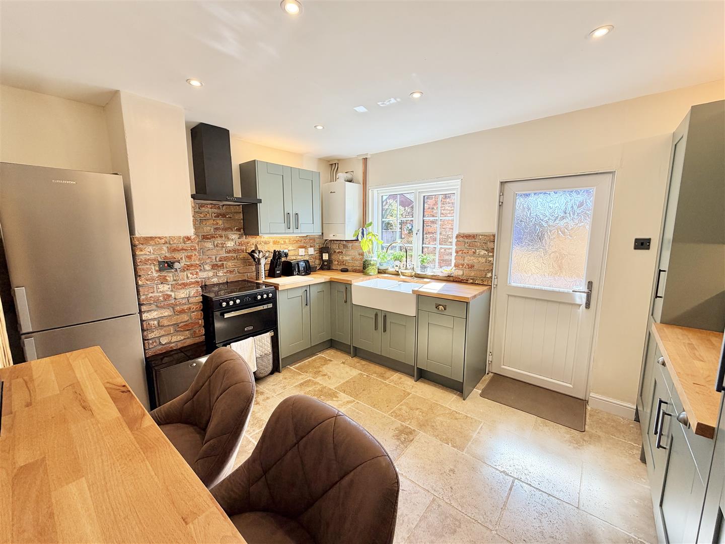 Adjacent is a contemporary kitchen fitted with modern base and wall units, solid wood worktops, and a breakfast bar. The exposed brick-style finish has been introduced by the current owner to give a period feel, complemented by a range of integrated appliances. A useful pantry sits behind a sliding door, while a window and door open out to the shared access area and, in turn, the gardens.