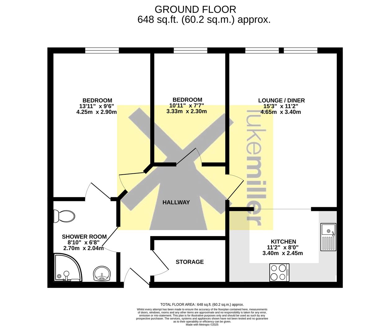 A two-bedroom second-floor apartment in the popular Meadowfields development with lift access. The layout includes a reception hall, lounge/diner, fitted kitchen, two bedrooms, and a modern wet room. Residents enjoy on-site amenities and a friendly community, with properties here seldom available.
