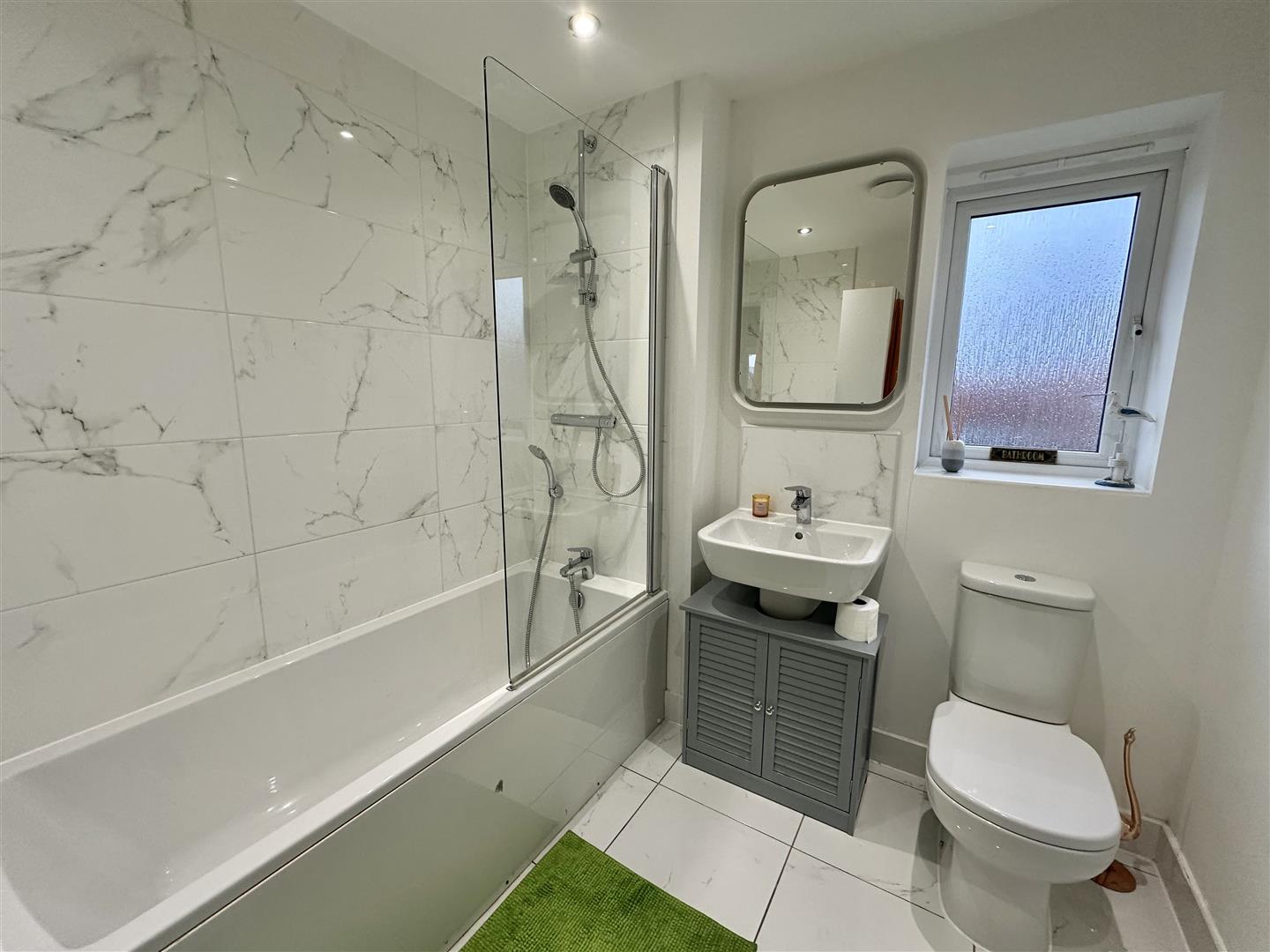 The main house bathroom is finished in a modern style and comprises a panelled bath with shower over and glazed screen, WC, pedestal wash hand basin and a window for natural light.