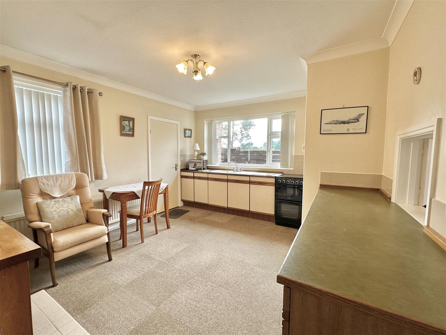 The kitchen is fitted with an extensive range of base and wall units, giving excellent storage alongside ample countertop workspace. There is space for a dining table and chairs, creating a sociable and practical area for family meals or casual dining. A window looks out over the rear garden, adding further light and a pleasant outlook.