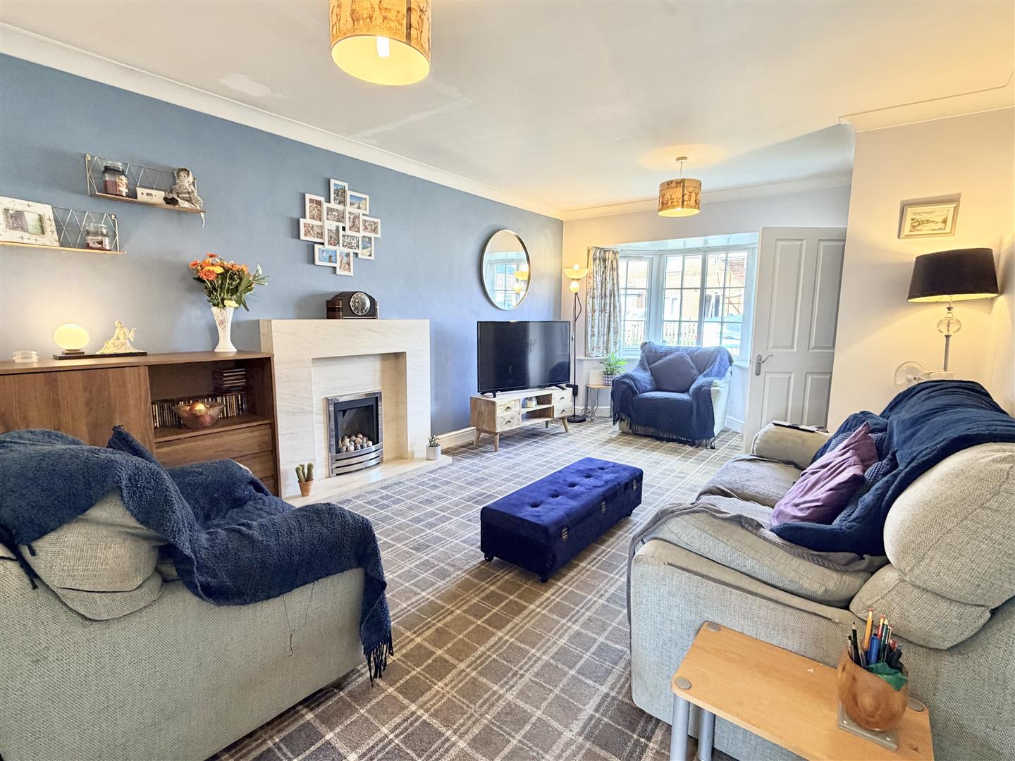 Positioned to the front, the lounge benefits from a double glazed bay window allowing good natural light. A modern stone fireplace with hearth and chrome living flame gas fire forms a central feature, with a further door leading through to the dining kitchen.