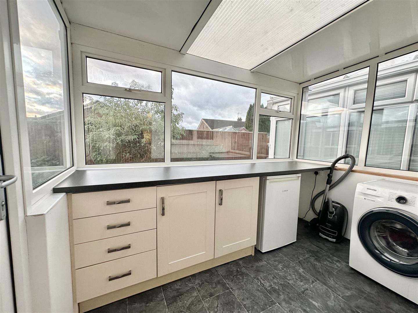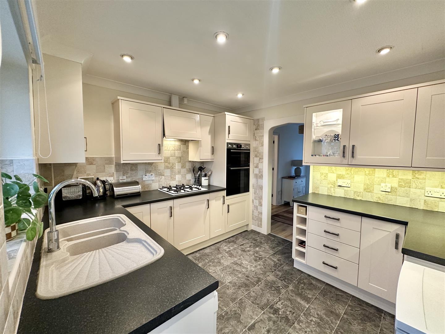 The kitchen provides an excellent range of storage cupboards together with fitted appliances, generous worktop areas and tiled splashbacks, creating a well-organised and functional space for daily use. A rear-facing window brings in natural light, and a door leads through to the utility and boot room, offering additional workspace and useful separation from the main living areas.