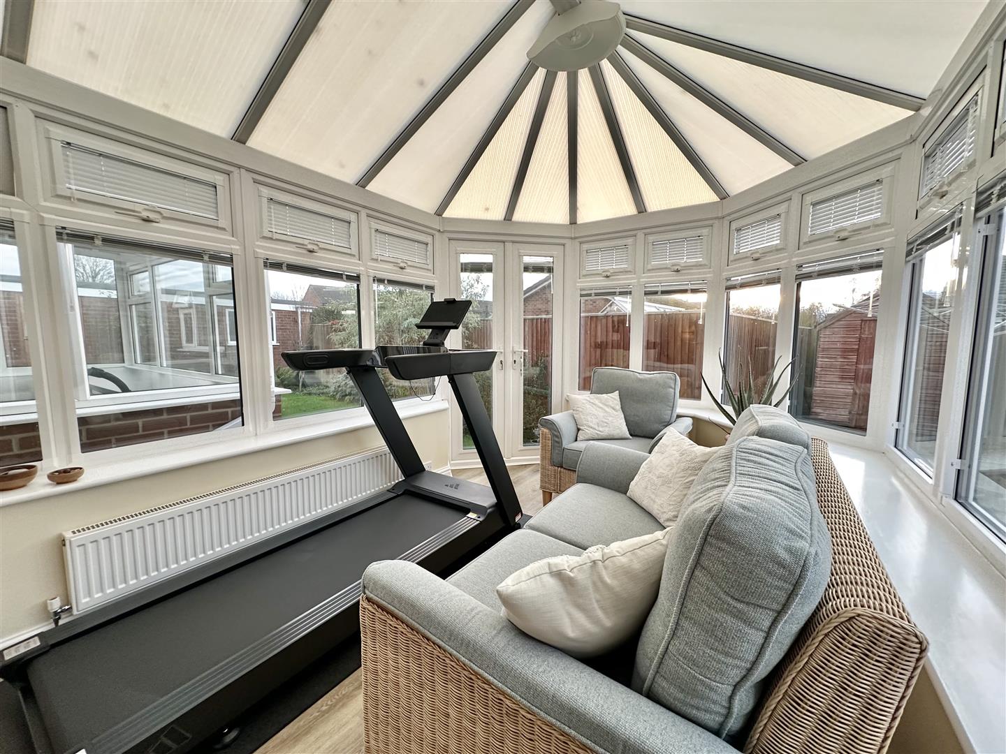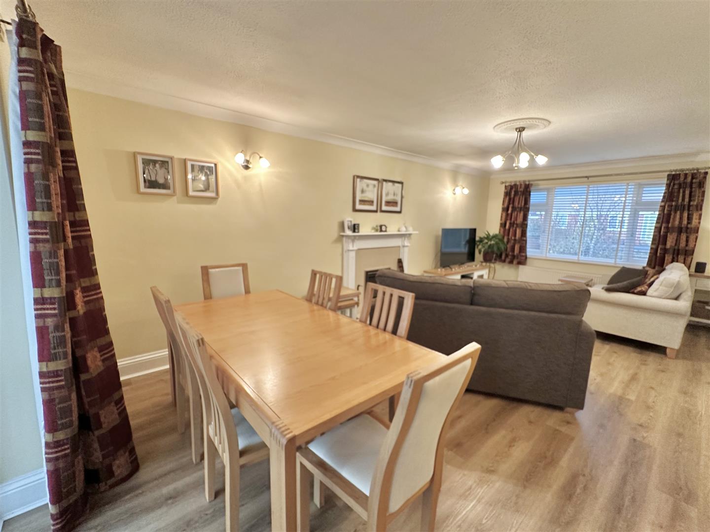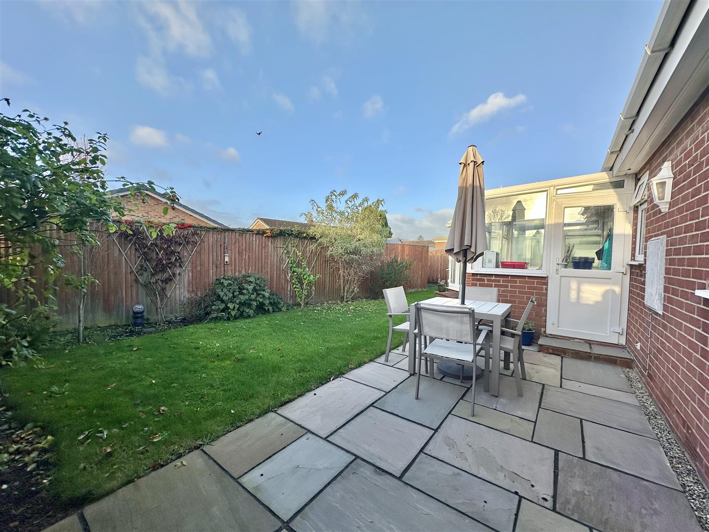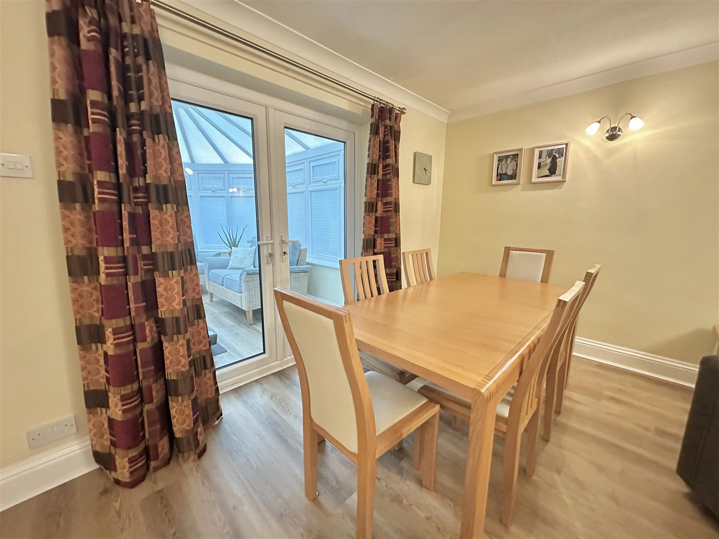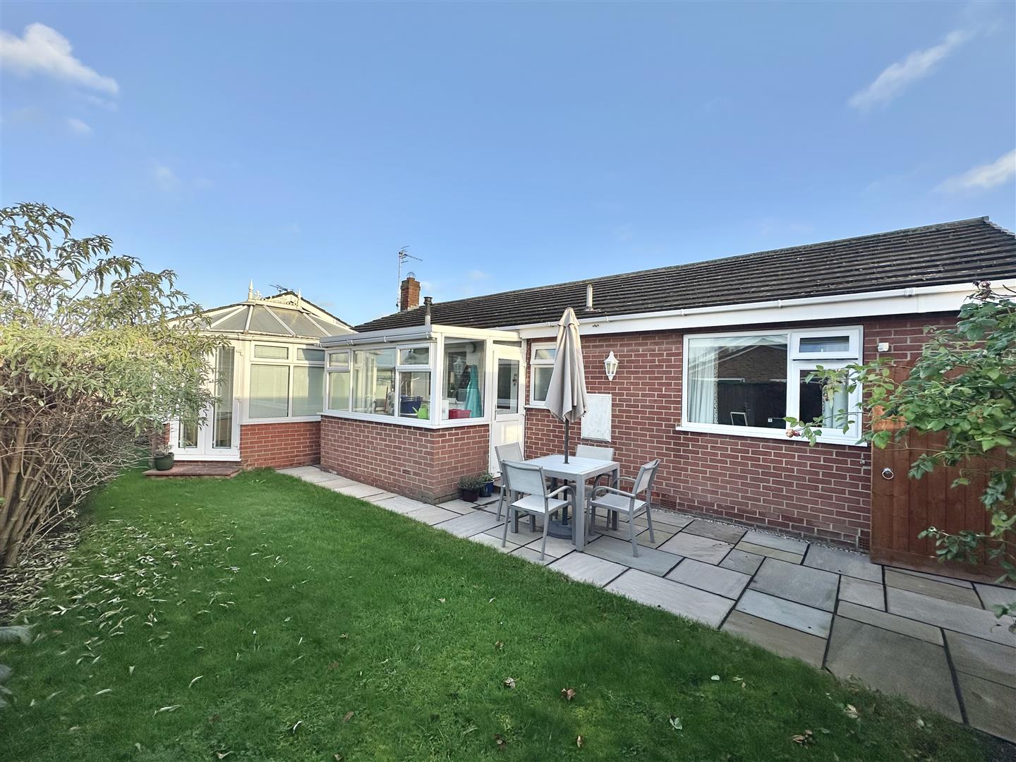 You enter the property through a practical porch vestibule, which leads into the reception hall providing access to the main accommodation and the loft via a hatch. The living room sits to the front of the home and offers generous space with a fire as the focal point. This room opens into the dining area, suitable for both day-to-day use and hosting. From here, double doors lead into the conservatory, a comfortable space overlooking the south-west facing rear garden.