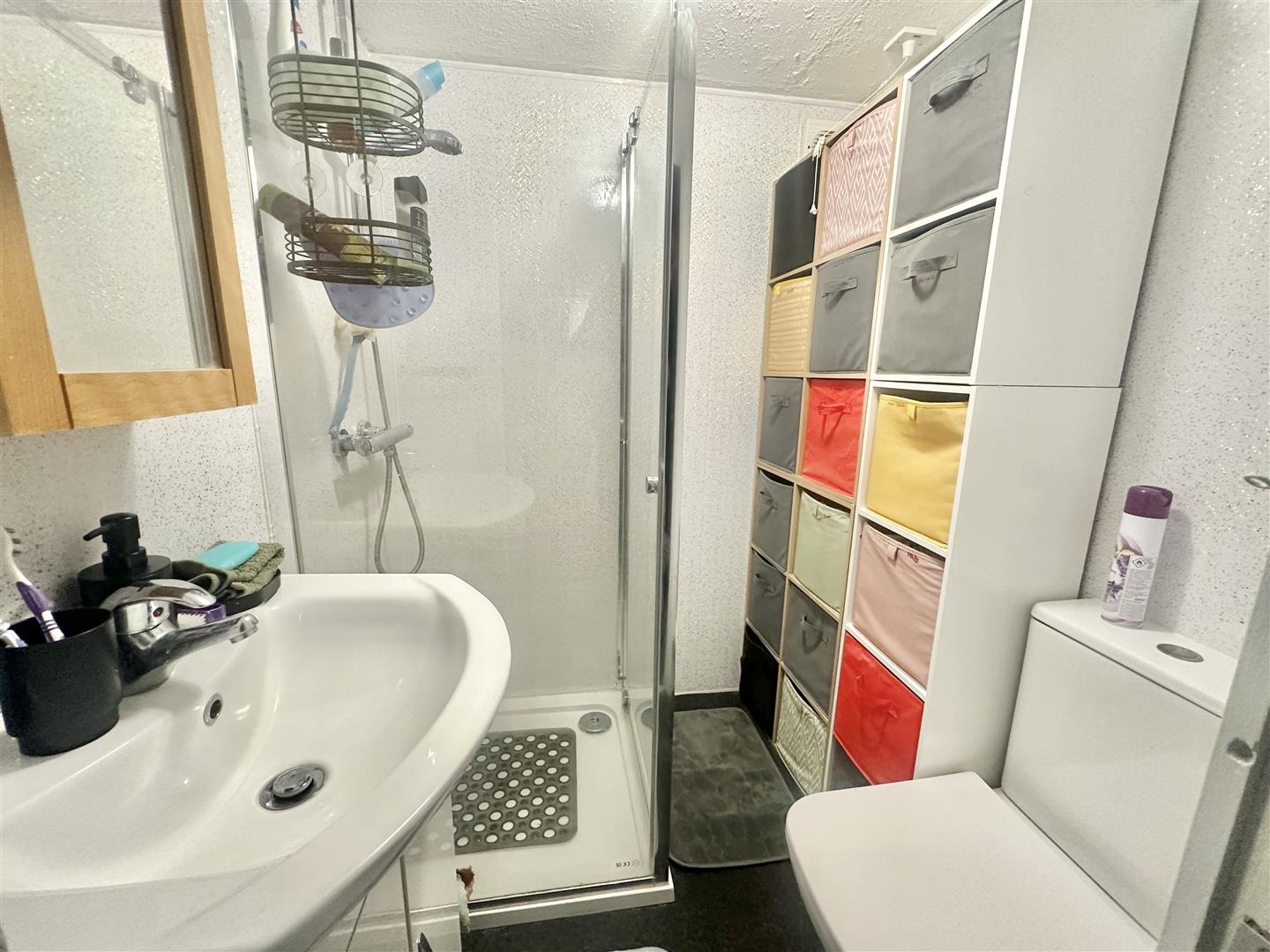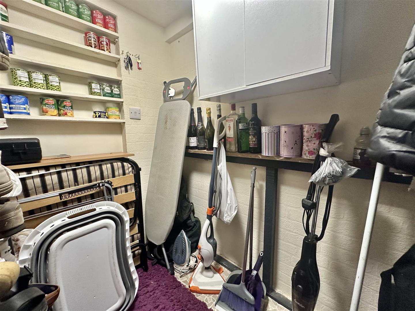 From the kitchen, an inner hall leads to a well-designed shower room, fitted with a large corner shower cubicle, wash hand basin on pedestal, and a low-level w.c. There is also a useful storage and utility room off the hallway, offering space for additional cupboards and plumbing for a washing machine.