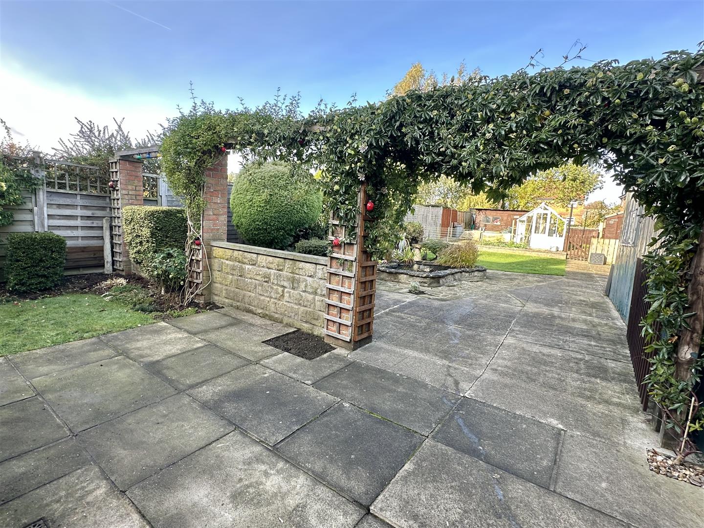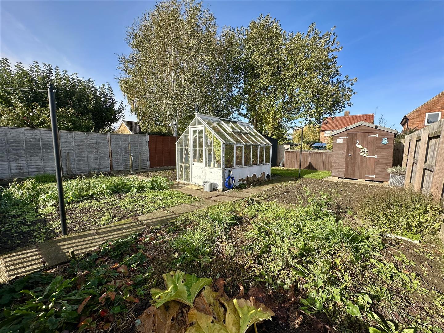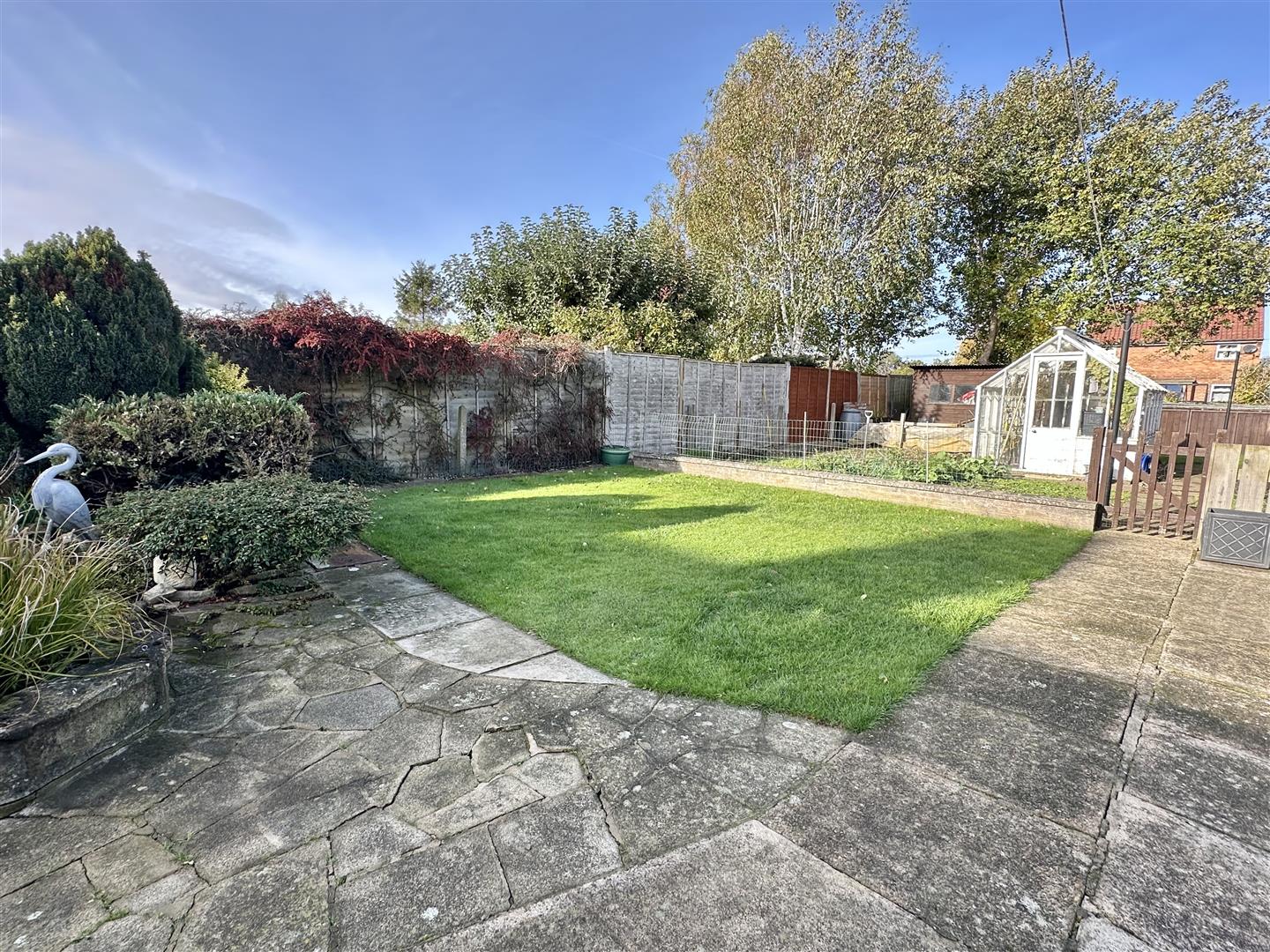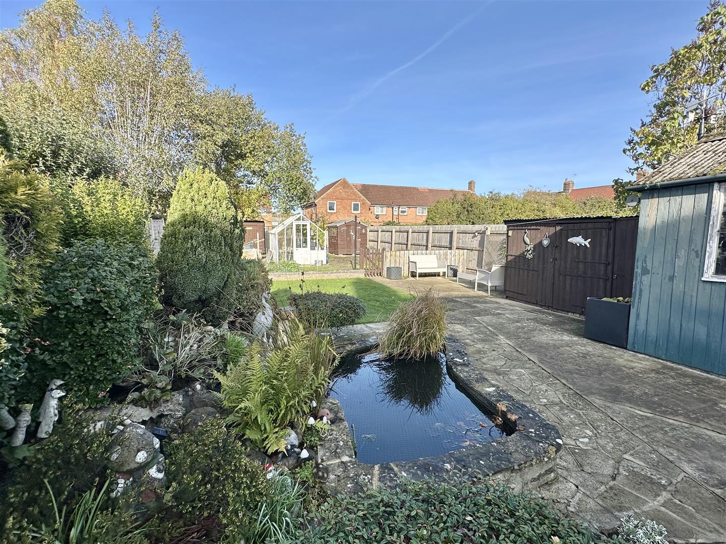 To the rear, the garden is a standout feature—thoughtfully arranged into distinct areas for relaxation, play, and cultivation. A large patio seating area leads to a lawned garden with flowering and herbaceous borders. Beyond this lies a decorative pond, further planting beds, and a dedicated area for fruit and vegetable growing, complete with greenhouse and mature grapevine.