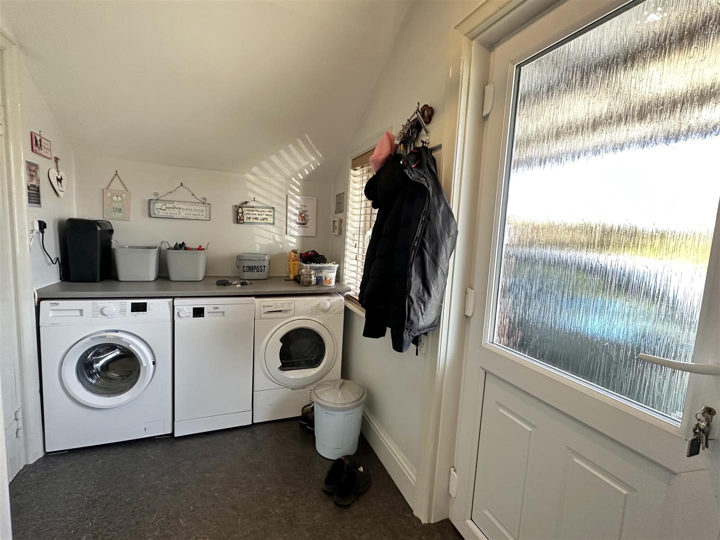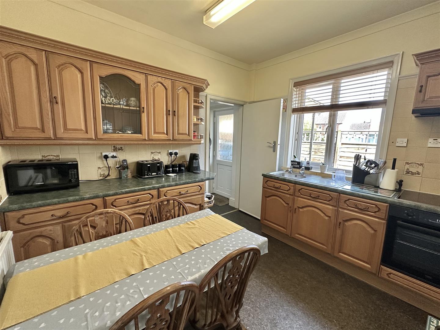The kitchen is well-appointed with a range of fitted base and wall units, ample worktop space, and room for a dining table and chairs, making it a practical and sociable space for daily use. A rear hall leads to a utility room and cloakroom, adding further convenience to the layout.