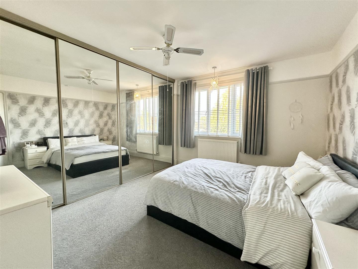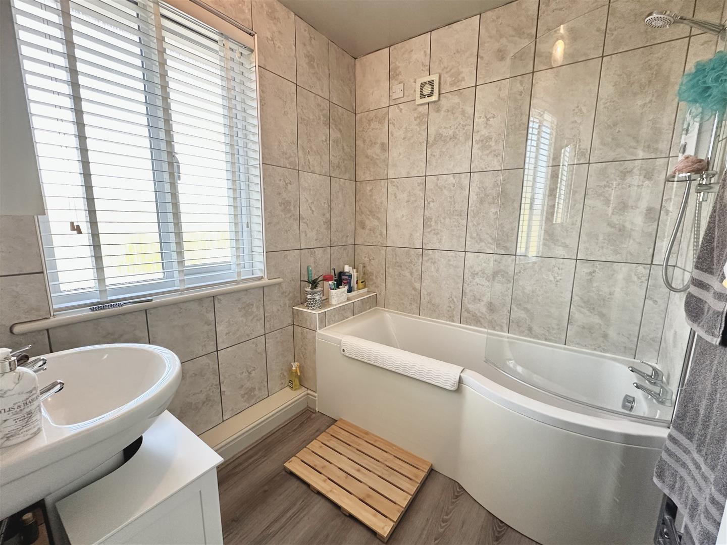 First Floor Upstairs, the property offers three well-proportioned bedrooms—two generous doubles and a good-sized single. The main bedrooms feature large windows that enhance the sense of space and light. The family bathroom comprises a three-piece suite including a panelled bath with shower over, WC, and pedestal wash basin, complemented by a contemporary tiled surround.