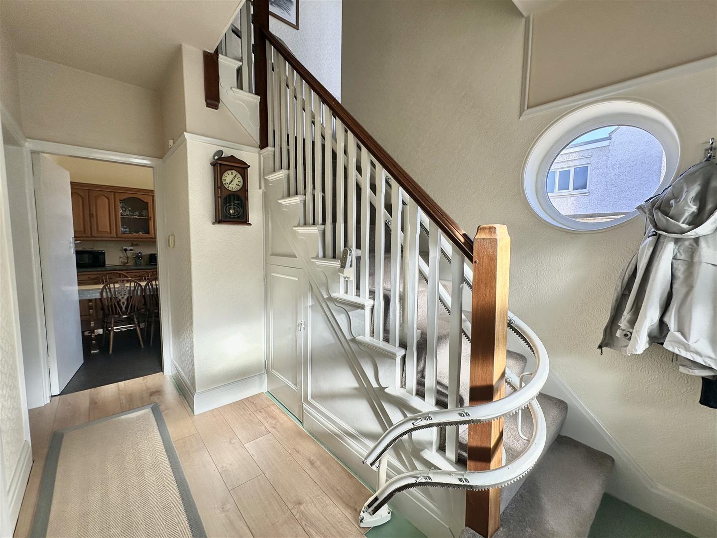 The stairwell benefits from a circular side window and an additional window at the top, allowing natural light to fill the space. A stairlift is currently installed, offering accessibility if required.