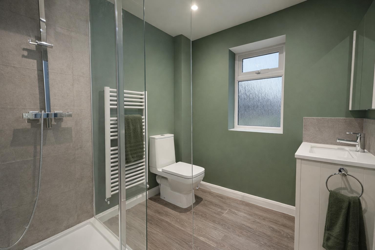 A key feature is the ground floor principal bedroom, a generous room with double doors opening onto the garden and a contemporary ensuite shower room with double walk-in shower, WC, and vanity storage. There is also a further bedroom or study and a separate WC completing the ground floor.