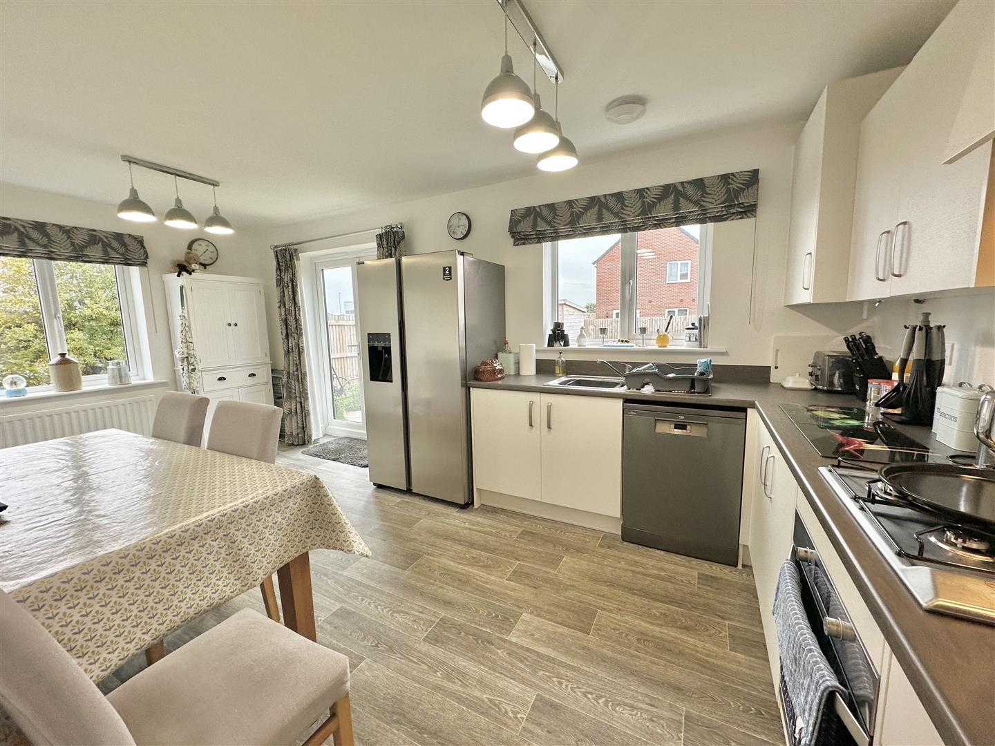 The living room is a comfortable size, enjoying natural light from dual aspects to the south and west. The dining kitchen offers modern fitted base and wall units, generous worktop space, and a range of integrated appliances. There’s plenty of room for a dining table and chairs, making this the natural hub of the home. Double doors open onto the rear garden, and windows to two elevations provide additional light.